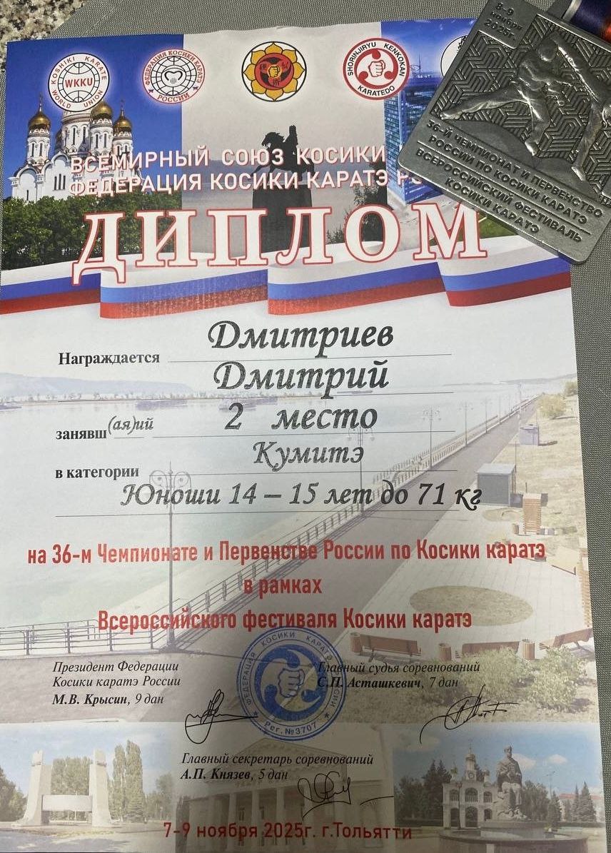 Кадет 8 «Р» класса Дмитриев Дмитрий завоевал второе место на 36-м Чемпионате и Первенстве России по Косики карате в рамках Всероссийского фестиваля этого вида спорта.