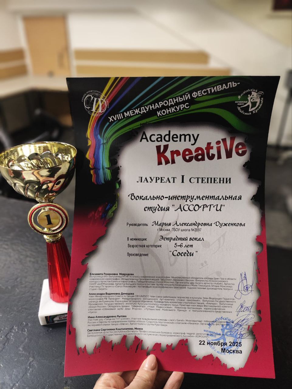 22 ноября воспитанники вокально-инструментальной студии «АССОРТИ» под руководством Дуженковой Марии Александровны приняли участие в международном фестивале-конкурсе «Academy Kreative». С песней «Соседи» наши талантливые исполнительницы завоевали звание ЛАУРЕАТА I степени!