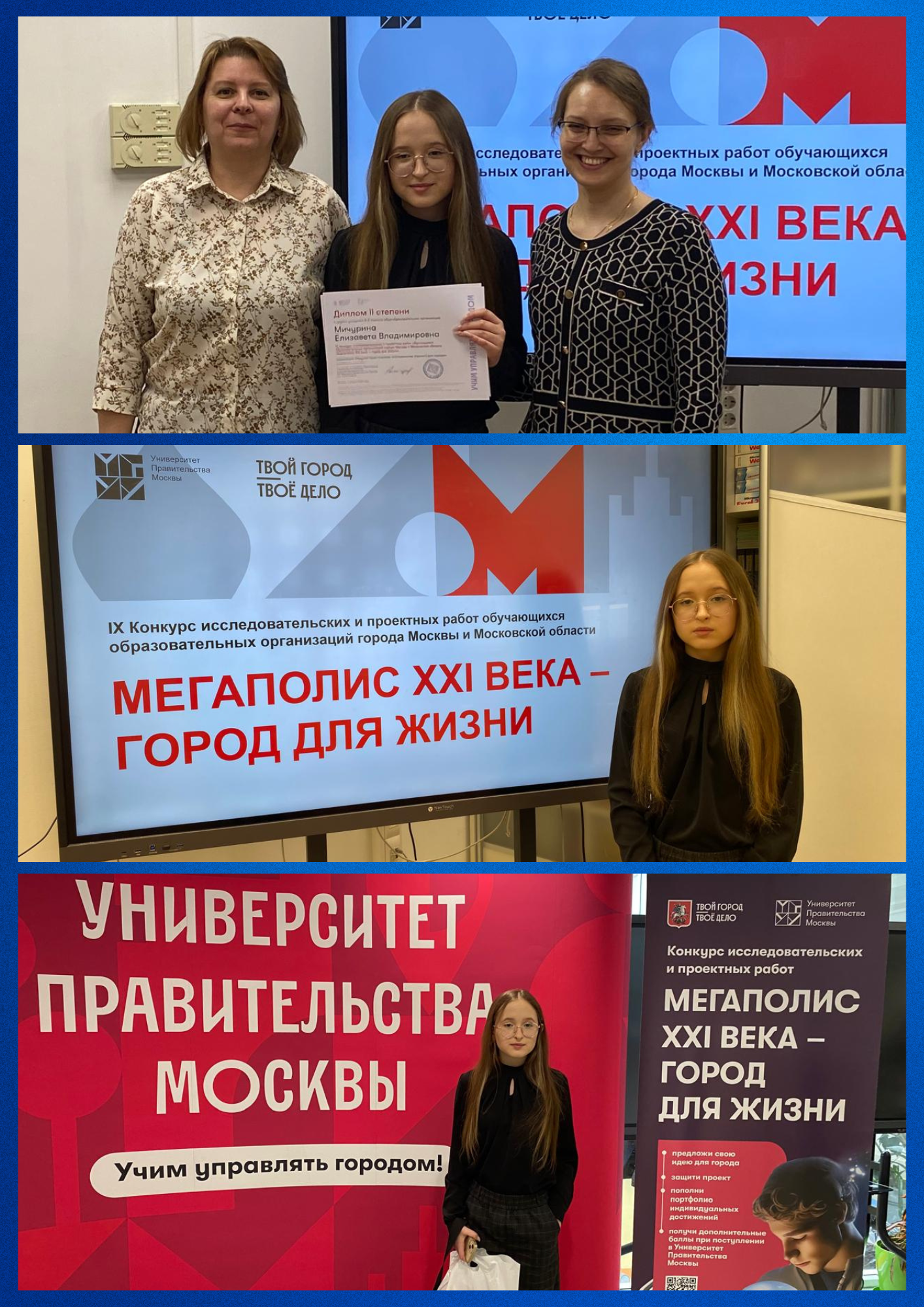 Учащиеся нашей школы приняли активное участие в IX Конкурсе исследовательских и проектных работ, обучающихся города Москвы и Московской области «Мегаполис XXI века- город для жизни» ГАОУ ВО «Московский городской университет управления Правительства Москвы имени Ю.М. Лужкова» (далее – Университет). Предметом Конкурса являлись исследовательские и проектные работы по актуальным и социально значимым для современного города вопросам развития городского пространства, формирования современной, комфортной для жизни инфраструктуры.