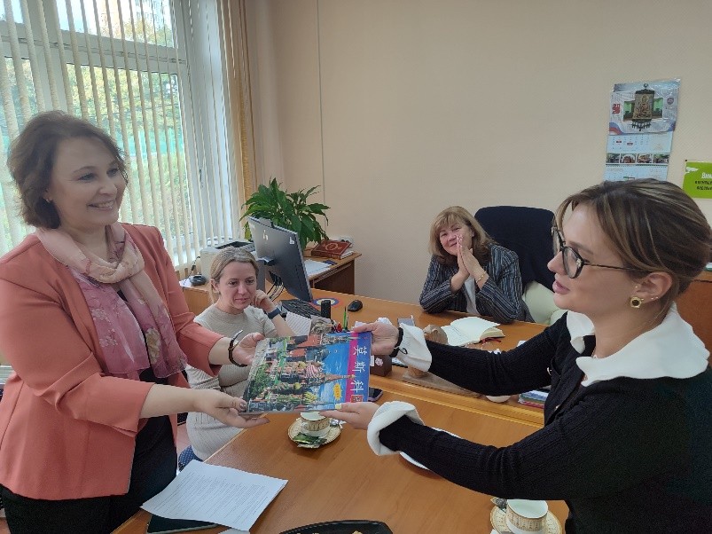 Нашим гостям Диана Альбертовна Будагова, учитель китайского языка передала в подарок Книгу о достопримечательностях города Москвы на китайском языке и отметила важное значение создания в рамках проекта разговорного клуба для изучающих китайский язык, а также возможность для учащихся и педагогов встреч со студентами из Китая для продолжения сотрудничества с образовательными организациями наших стран.