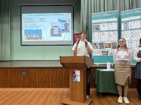 Анна С., Всеволод Н.- учащиеся 11 «В», медицинского класса, классный руководитель Юшина Е.В., к.п.н., учитель биологии. Ребята рассказали о своих успешных защитах работ на предпрофессиональных конференциях города Москвы: «Старт в медицину», «Наука для жизни», а также об участии во Всероссийском конкурсе «Большие вызовы», участии в профильных сменах в Сириусе.